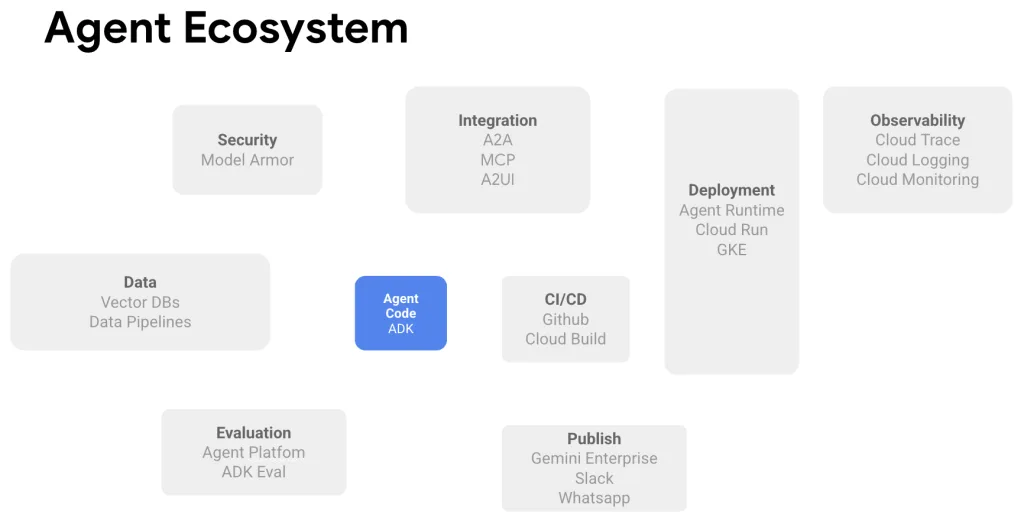 - Deploy: az Agents CLI automatizálja a teljes deployment fázist – Infrastructure as Code generálása, CI/CD pipeline konfigurálása, majd közvetlen deployment Cloud Runra, Agent Runtime-ra vagy GKE-re.