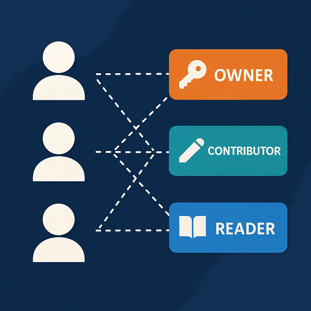 - Szerepkörök (Roles) – engedélyek gyűjteménye, például „Reader”, „Contributor” vagy „Owner”.